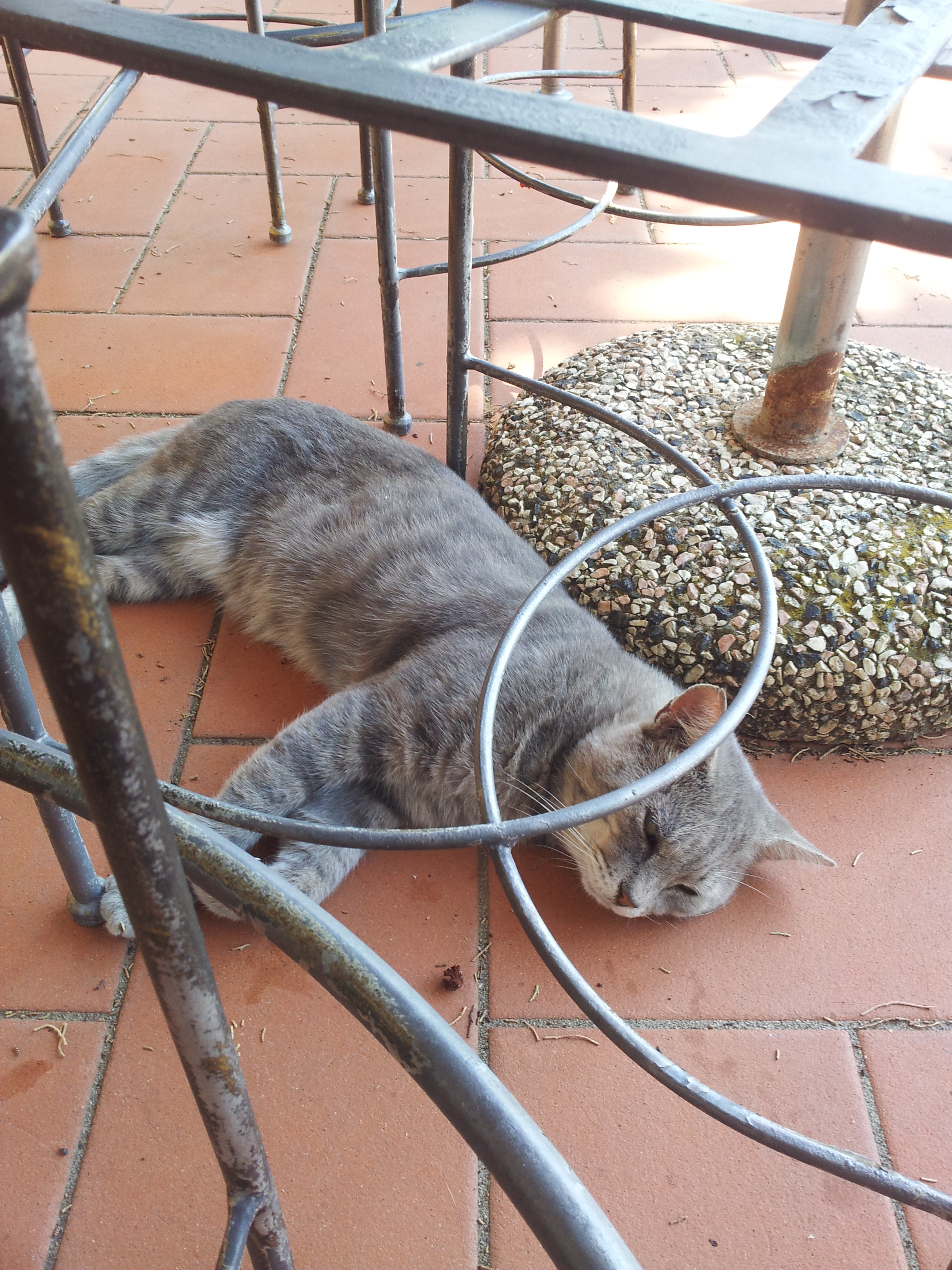 In Bar Solferino, Bianco the big white puppy was fidgeting on his owner’s lap. Only three months old but already enormous and likely to knock everything flying if put down on the floor! A little later he and his owner were outside and Bianco obviously needed something to chew as he was having a go at one of the wooden benches! We have very fond memories of our dogs chewing through the furniture and still have a tooth marked bamboo coffee table in our sitting room. Now we have grand-dogs, and always carry dog chews in the car, so we gave one to Bianco. His owner was more than grateful as he could now spend the next hour or so watching the world go by without having to occupy the teething puppy! Bless.