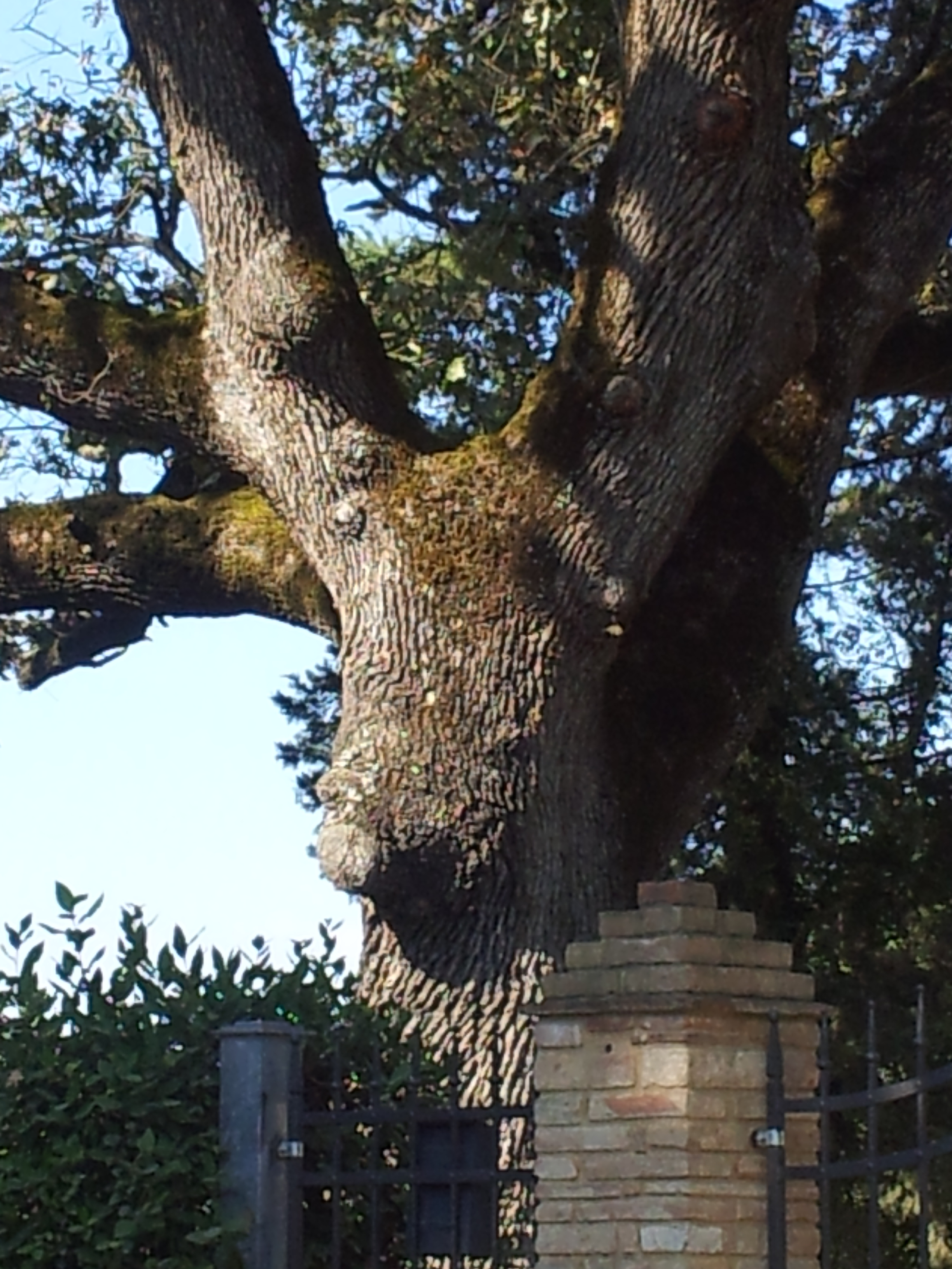 Back in our beautiful bit of Chianti countryside, we have taken to popping outside the front door with a couple of chairs for an aperitivo before lunch, because there is some shade there at that time of day. You will remember that our current home is guarded at the front gate by a huge ancient oak tree (querceto) and last weekend I had the strangest feeling that I was being stared at. I looked at the tree and it had suddenly taken on the face of a moose! Yes, I know I was on the second glass of wine, but here is the proof! If you cannot see what I can see then perhaps I should make an appointment to go and see my lovely doctor Flavio. Please tell me you can see it’s face….