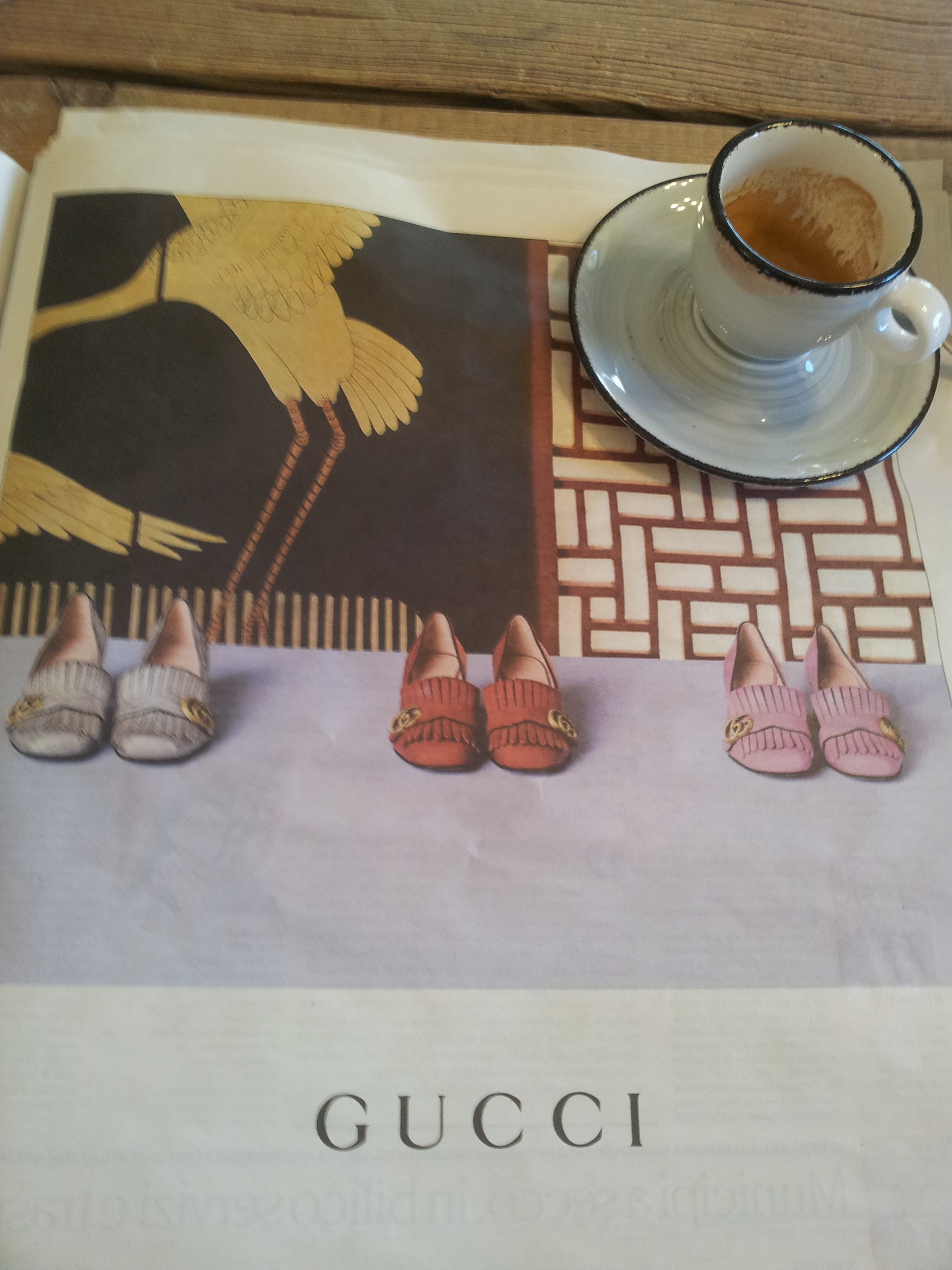 Anyway, to change the subject and taking you back to La Dispensa caffee bar in Fiano, I was reading the paper over my morning coffee and saw these beautiful Gucci shoes advertised. The orange pair in the middle exactly matches my current handbag. What do you think? Would it be over indulgent on my part, to buy these on-line?